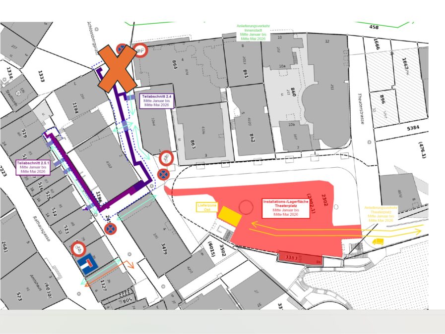 Die Bautätigkeiten in der Innenstadt haben einen sehr starken Einfluss auf das öffentliche Leben und damit auch Auswirkungen auf die begrenzte Kapazität der bestehenden Verkehrsflächen. Aktuell laufen die intensiven Tiefbauarbeiten an der Theaterstrasse und in der Zwingelhofgasse. Die Zufahrt zum Theaterplatz ist nur über die Ölrainstrasse zur “Lieferzone Ost” möglich.
